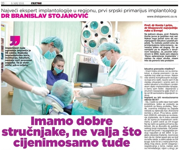 Primarijus Dr Branislav Stojanović je za majski broj magazina Faktor govorio o implantima i implantologiji. Ceo intervju možete videti na slici ispod, a klikom se otvara PDF stranica Faktor magazina.