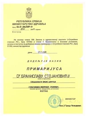 Prim. dr Branislav Stojanović zajedno sa grupom entuzijasta postavlja temelje moderne implantologije u Srbiji i smatra se za jednog od njenih utemeljivača u Srbiji. Učestvovao je na velikom broju domaćih i internacionalnih kongresa, i objavio veliki broj radova iz oblasti implantologije. Na osnovu dugogodišnjeg iskustva, doprinosa u razvoju stomatologije a posebno implantologije, kao i broja objavljenih radova, dr Stojanović je stekao titulu primarijusa 2009. godine.